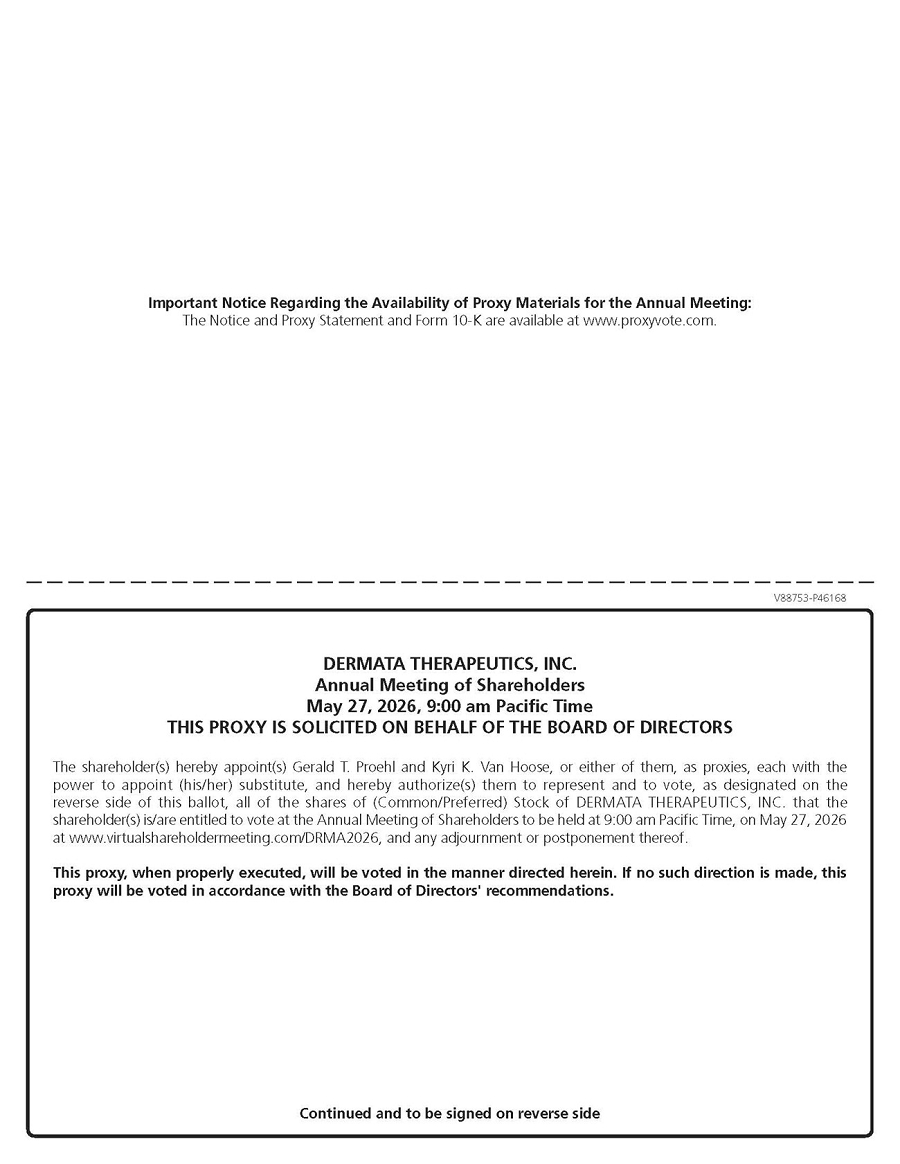 NOTICE IS HEREBY GIVEN that the Annual Meeting of Stockholders (the “Annual Meeting”) of Dermata Therapeutics, Inc. (the “Company”) will be held on May 27, 2026, at 9:00 a.m. Pacific Time. The Annual Meeting will be held in a virtual meeting format at http://www.virtualshareholdermeeting.com/DRMA2026. You will not be able to attend the Annual Meeting in person.