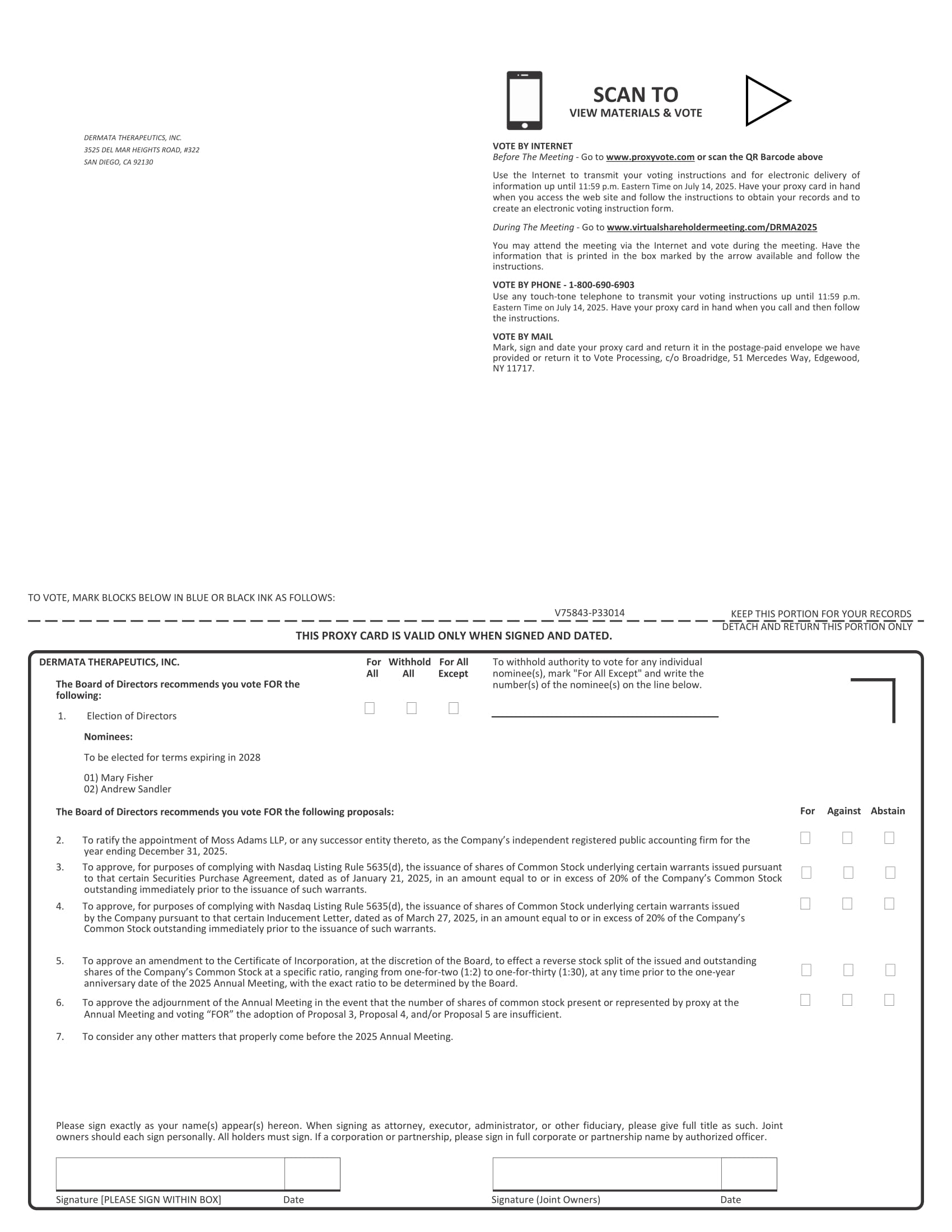 Stockholders may also vote, and submit written questions, during the Annual Meeting at http://www.virtualshareholdermeeting.com/DRMA2025. To demonstrate proof of stock ownership, you will need to enter the control number received with your Notice, proxy card or voting instruction form. If you hold your shares in “street name” (that is, through a broker or other nominee), you will need authorization from your broker or nominee in order to vote. We intend to answer questions submitted during the meeting that are pertinent to the Company and the items being brought for stockholder vote at the Annual Meeting, as time permits, and in accordance with the Rules of Conduct for the Annual Meeting. To promote fairness, efficiently use the Company’s resources and ensure all stockholder questions are able to be addressed, we will respond to no more than one question from a single stockholder. Questions and answers will be grouped by topic and substantially similar questions will be grouped and answered once. We have retained Broadridge Financial Solutions to host our virtual annual meeting and to distribute, receive, count and tabulate proxies.