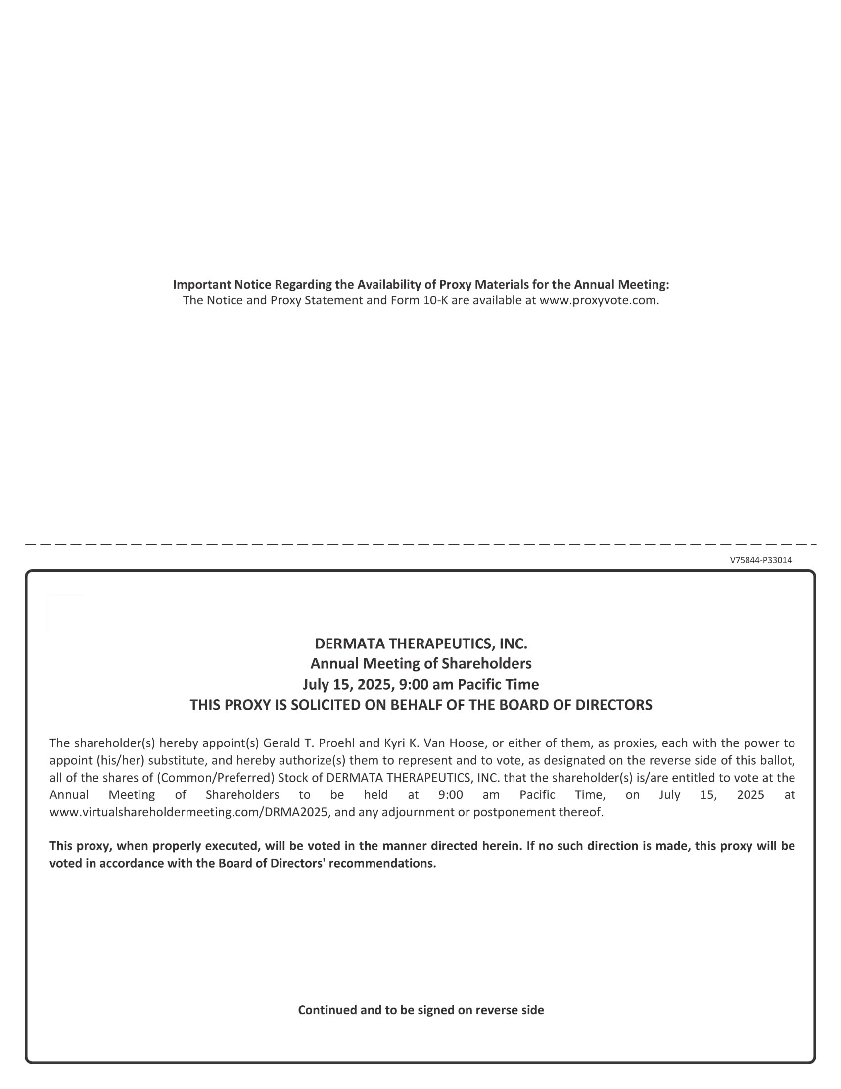 NOTICE IS HEREBY GIVEN that the Annual Meeting of Stockholders (the “Annual Meeting”) of Dermata Therapeutics, Inc. (the “Company”) will be held on July 15, 2025, at 9:00 a.m. Pacific Time. The Annual Meeting will be held in a virtual meeting format at http://www.virtualshareholdermeeting.com/DRMA2025. You will not be able to attend the Annual Meeting in person.
